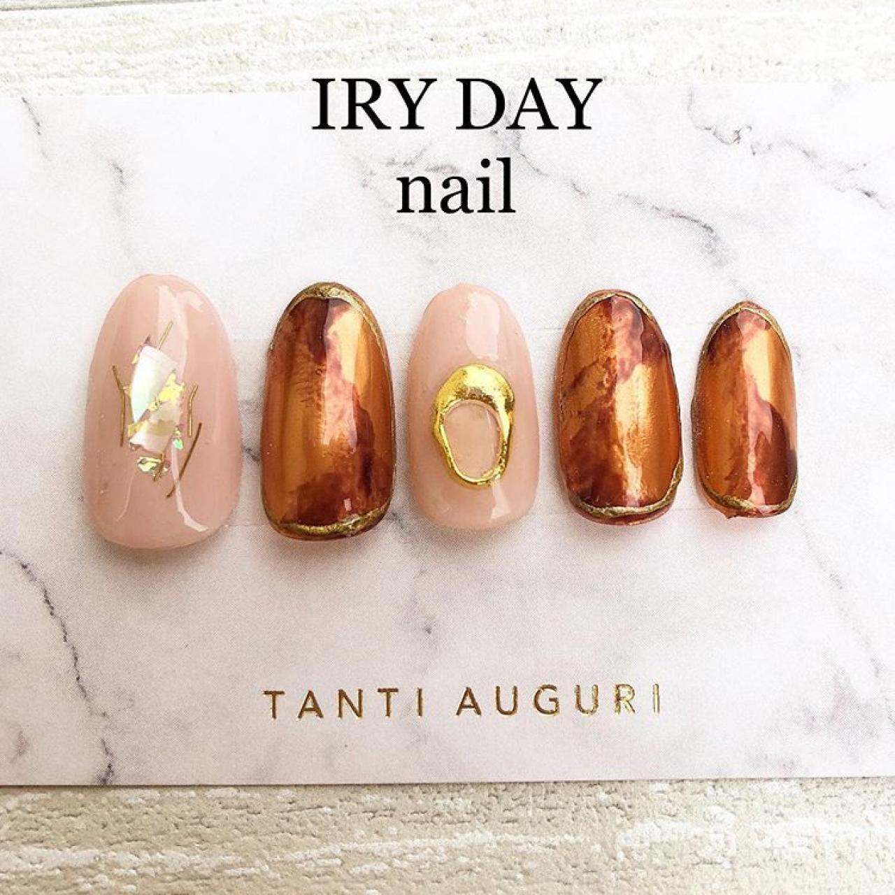 本日入荷しました、ブロンズゴールドのミラーネイルパウダーを使った大人可愛いネイルをデザインしてみました。